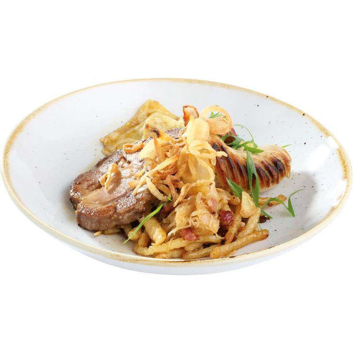 Cūkas cepetis, šupfnūdeles ar šķovētiem kāpostiem, maultašu, bekonu un rostsīpoliem